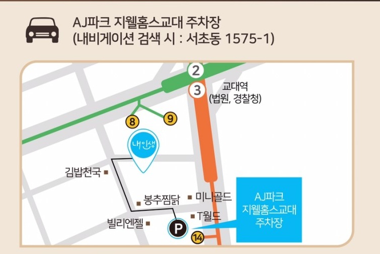 안녕하세요^^ 내인생치과 입니다. 차량을 가지고 내원해주시는 환자분들을 위해 주차 이용 안내를 도와드리려고 합니다^^ 환자분들께서 주차고민 없이 편하게 내원하셨으면 하는 마음에 내인생치과와 가까운 AJ파크 지웰홈스 교대 주차장과 정기계약을 맺었습니다. 내비게이션 검색 시 : 서초동 1575-1 주소 : 서울특별시 서초구 반포대로 28길 94 (교대역 1…