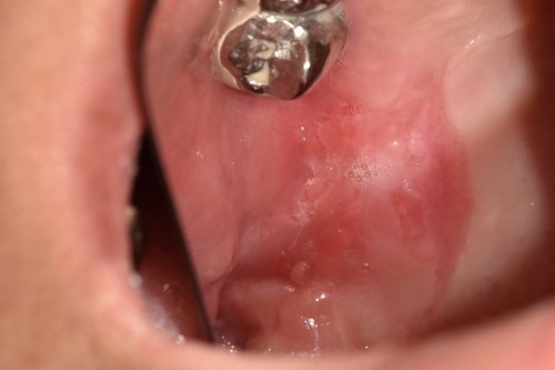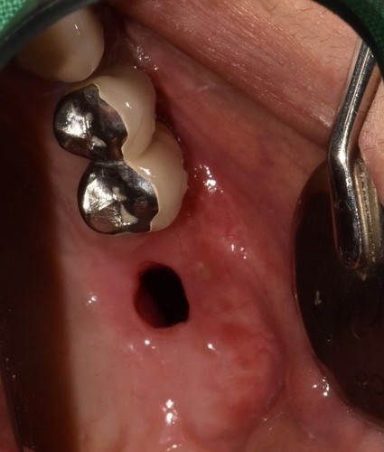 보통 5mm보다 작은 천공은 상악동염증이 없는 경우에는 자연치유 된다고 주장하는 논문도 있고 3mm 보다 작은 천공은 자연치유 된다고 말하는 논문도 있습니다. 하지만 제가 현재까지 약 30명 가량의 상악동누공폐쇄술을 했는데 환자 중에서 4mm 정도의 천공이 자연치유되지 않아서 폐쇄술을 한 경우도 2명 정도 있었습니다. 이걸로 보아서 5mm 보다는 3mm 보다 작은 천공이 자연치유 된다는 주장이 더 합당하다고 생각됩니다. 그래서 이 환자분은 10mm 이상의 매우 커다란 천공이 있었기 때문에 반드시 폐쇄술을 시행해 주어야 하지만 잇몸 상태가 너무 안 좋아서 잇몸이 어느 정도 치유될 때까지 기다린 후에 상악동누공폐쇄술을 계획하였고 성공적으로 잘 막혔습니다.